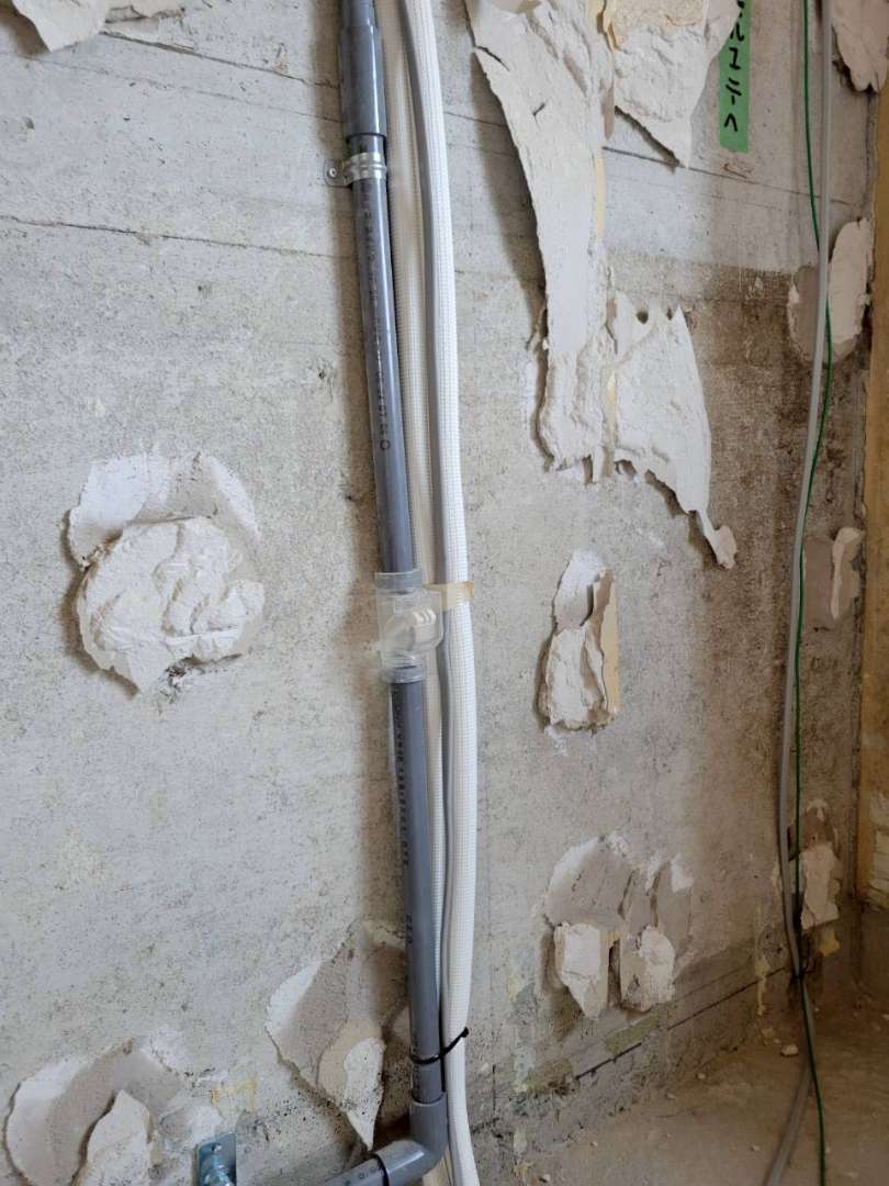 室内機・室外機の撤去後、まず壁内部の配管状態を丁寧に確認。長年使用されていた既存配管には劣化が見られたため、必要な範囲で壁下地を露出させ、新しい配管ルートを再構築しました。